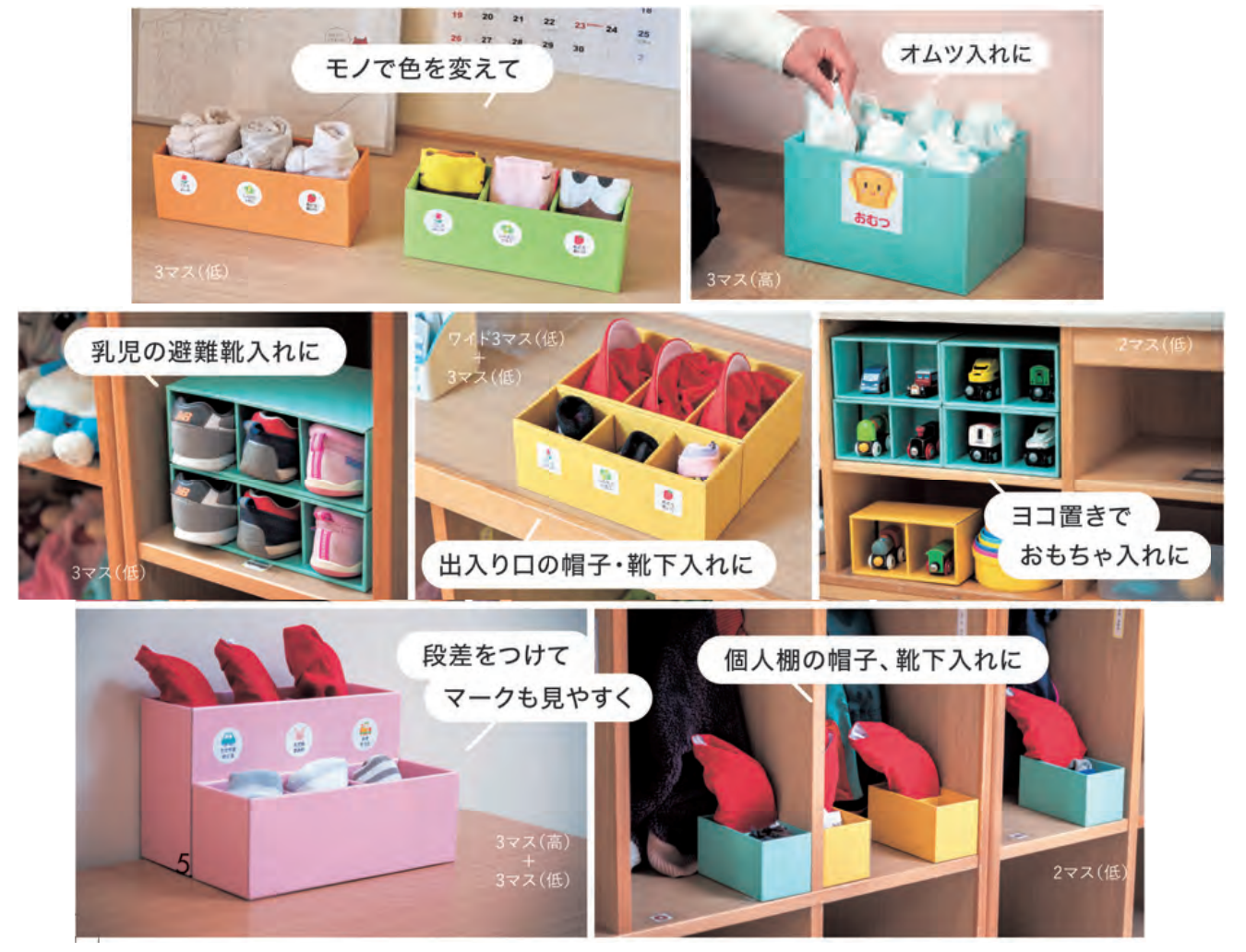 牛乳パックで作っていたケースを既製品で。2マスと3マス、それぞれ低い・高いサイズがあり、各2個セットにしました。園児定員に合わせて組み合わせが可能です。組み合わせて段差がある収納にしてもOK。クラフト製で丈夫なのに、破棄するときは環境にやさしくリサイクル可。