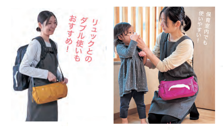 「えがおのせんせい」のお散歩バッグは全てティッシュがすぐに取り出せ、